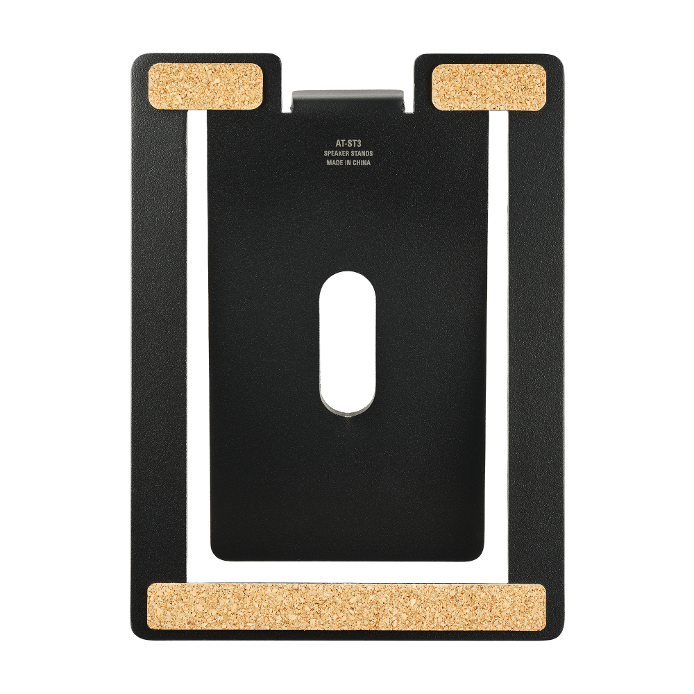 De AT-ST3-luidsprekerstandaards zorgen ervoor dat uw AT-SP3X of andere boekenplankluidsprekers van vergelijkbare afmetingen optimaal geluid kunnen weergeven. Elke standaard is gemaakt van stevig gelegeerd staal met trillingsdempende kurken voetjes en biedt stevige ondersteuning voor een luidspreker met een gewicht tot 3 kg (6,6 lbs). Het oppervlak van de standaard waarop de luidspreker wordt geplaatst, is bekleed met urethaanschuim om ongewenste trillingen verder te onderdrukken. Het oppervlak heeft een lichte hoek van 13 graden, ervan uitgaande dat er op korte afstand van de luidsprekers naar muziek wordt geluisterd. De hoek voorkomt ook dat geluidsgolven worden weerkaatst door harde oppervlakken, wat een negatieve invloed kan hebben op de geluidskwaliteit.