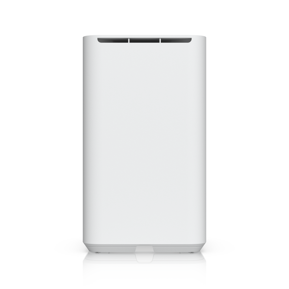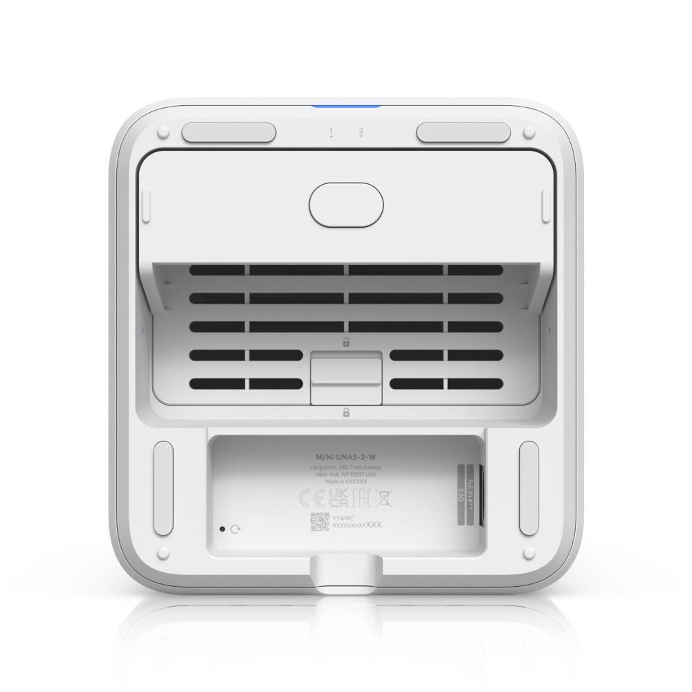 UniFi Network Attached Storage met (2) 3,5-inch HDD-bays, 2,5 GbE-netwerk, USB-C-connectiviteit en een meegeleverde PoE++-adapter, allemaal in een compact formaat.