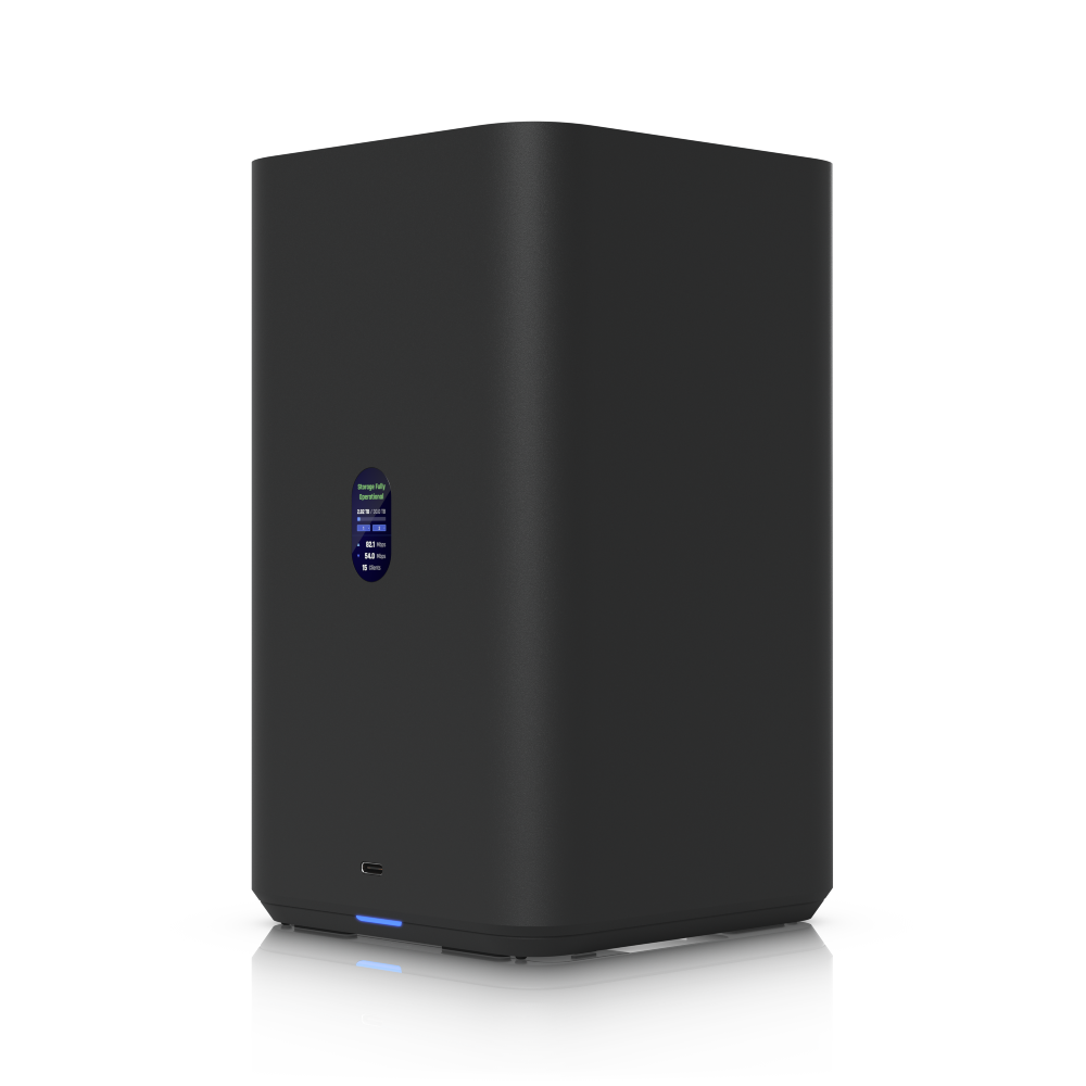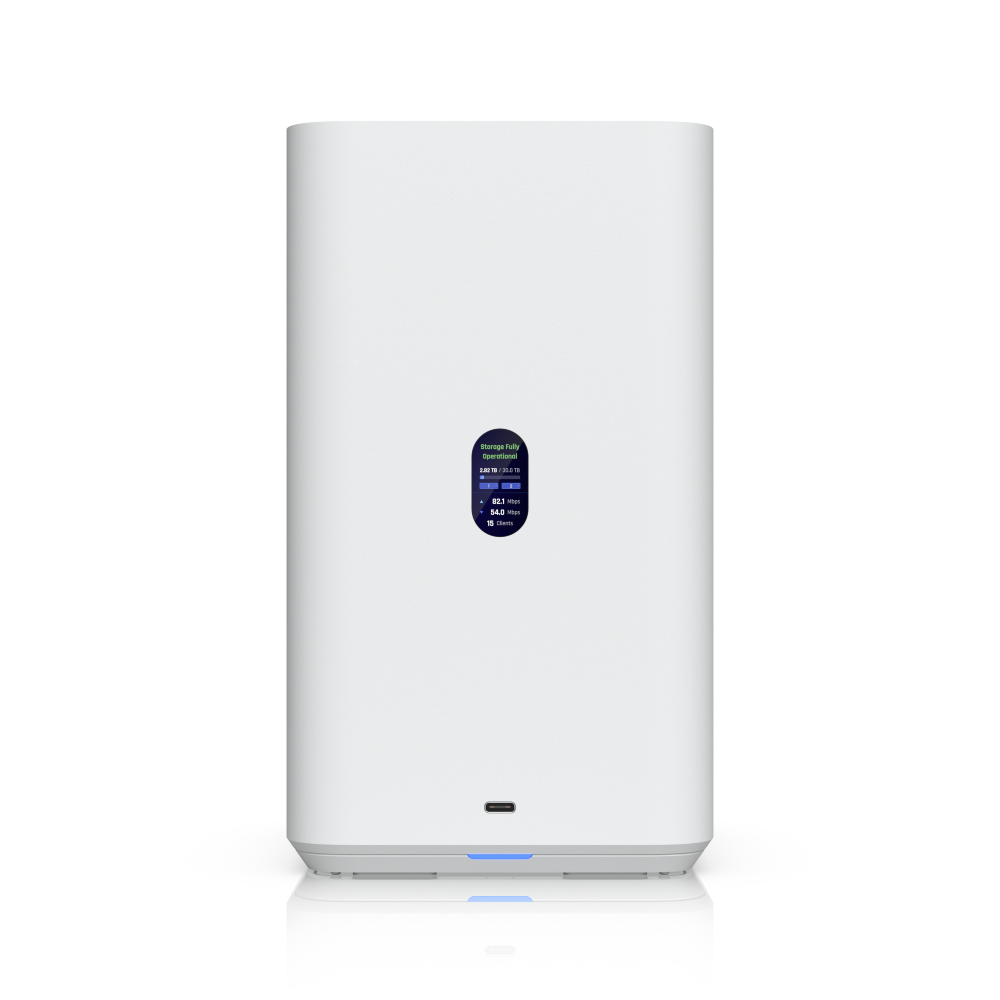 UniFi Network Attached Storage met (2) 3,5-inch HDD-bays, 2,5 GbE-netwerk, USB-C-connectiviteit en een meegeleverde PoE++-adapter, allemaal in een compact formaat.