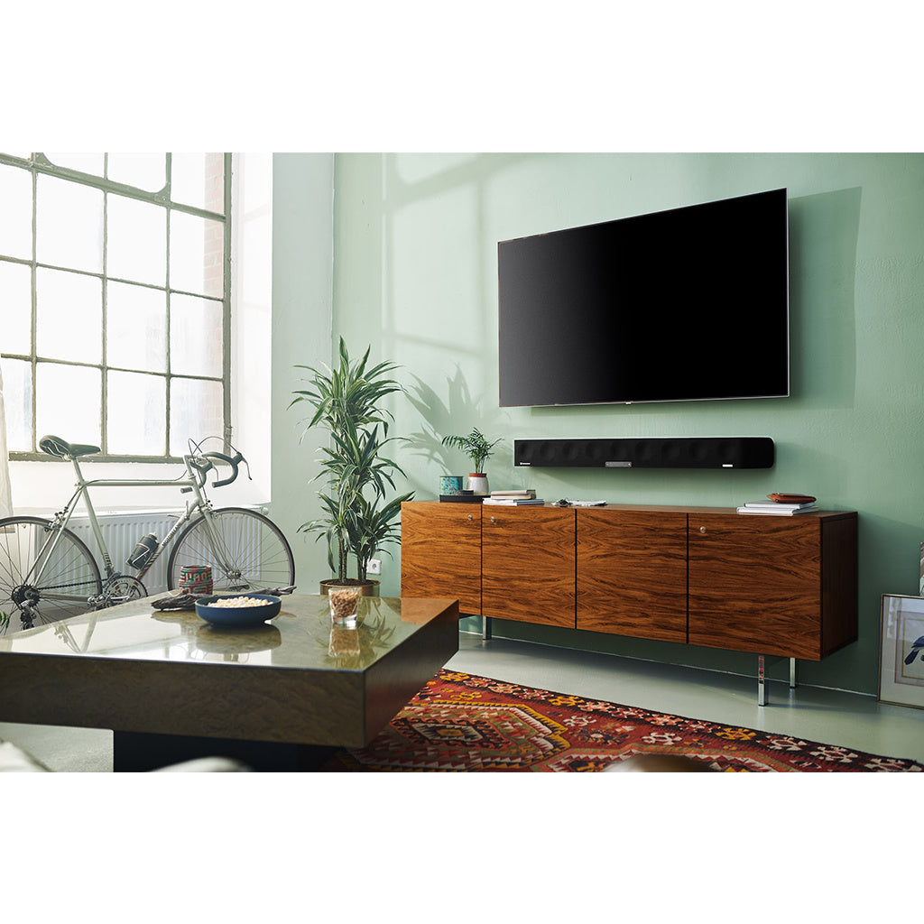 De AMBEO Soundbar Max is een mooi vormgegeven soundbar en is voorzien van 13 speakers waarmee een overweldigende 5.1.4 meerkanaals geluidsweergave wordt bereikt. De laagweergave van de AMBEO Soundbar Max begint al bij 30 Hertz zodat je zelfs geen subwoofer meer nodig hebt. Hiermee zet Sennheiser de nieuwe referentie neer voor soundbars. Voor een optimale multichannel beleving is er een optionele muurbeugel verkrijgbaar waarmee de soundbar op de juiste hoogte onder de televisie kan worden opgehangen. Bovendien is de soundbar voorzien van een geavanceerd inmeetsysteem waarmee de surround parameters automatisch worden afgestemd op jouw specifieke thuissituatie. De precisie waarmee het driedimensionale geluidsbeeld wordt neergezet is ongeëvenaard.