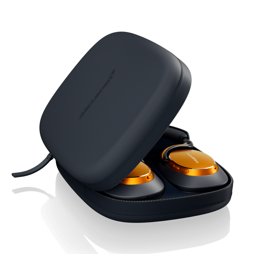 Antracietgrijs nappaleer op alle zichtbare oppervlakken, papaya-kleurige metallic oorschelpen en een reliëf McLaren-logo op de hoofdband maken het ontwerp compleet.