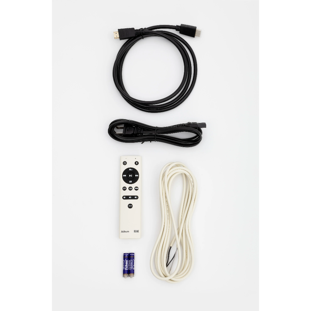 Omvang van de leveringELAC Debut ConneX DCB41 Adsum, Stoffen afneembare fronten, Witte IR-afstandsbediening, Netsnoer, HDMI kabel, Luidsprekerkabel, Rubber plakdopjes, Batterijen, Luidsprekerstandaards