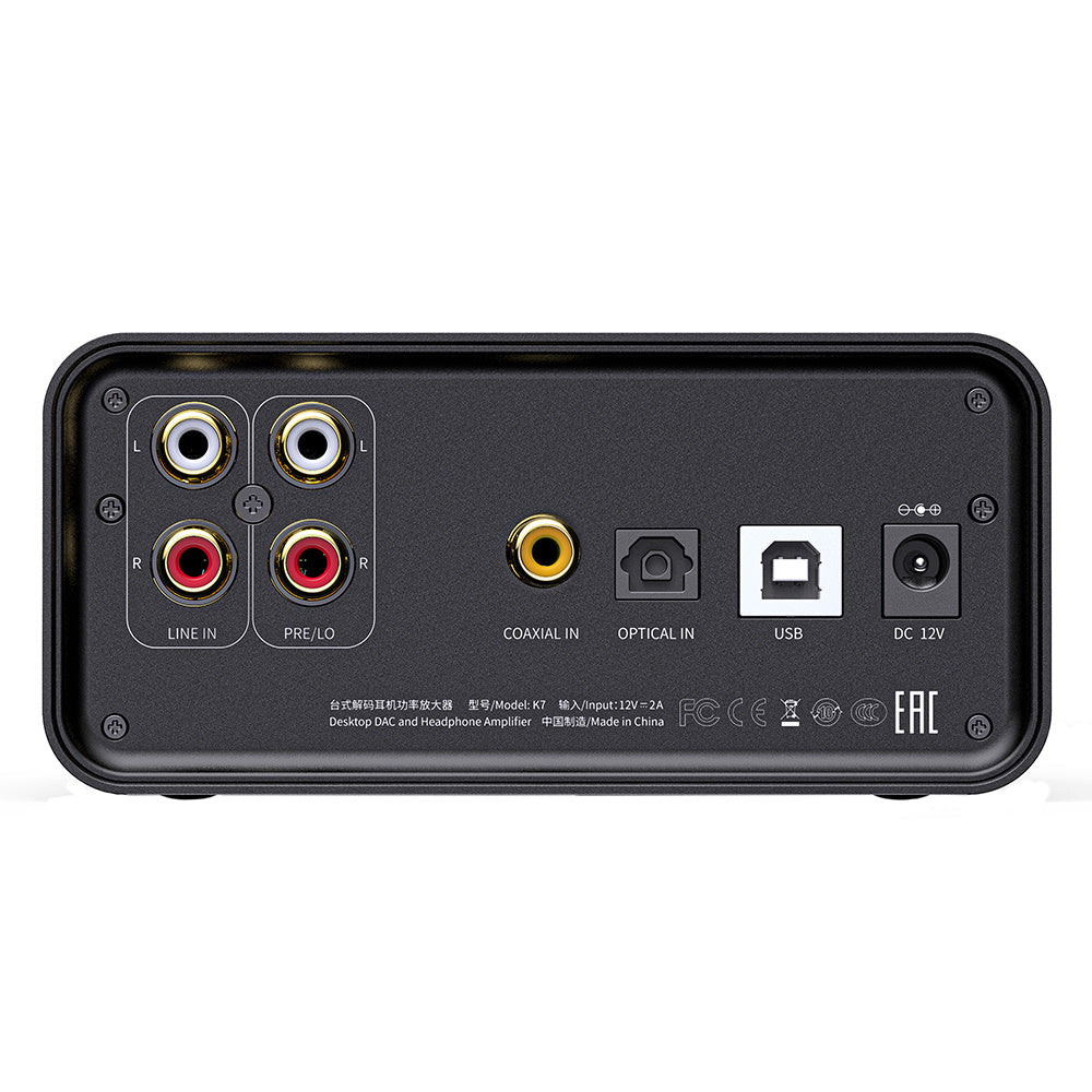 Wat de versterker betreft, past de K7 de THX AAA 788+ toe die werd ontworpen voor desktop apparaten. Onder een belasting van 300Ω bij 1% vervorming van elk kanaal kan hij 560mW uitvoeren, en 2000mW bij een belasting van 32Ω bij 1% vervorming van elk kanaal. De linker- en rechterkanalen van de DAC zijn elk uitgerust met AKM's nieuwste AK4493SEQ DAC-chip, voor een klassieke hoge kwaliteit en warm geluid. Wat betreft de USB decoderingschip, de XMOS XUF208 in de K7 maakt gebruik van dubbel klokbeheer om verschillende muziekformaten met gemak te verwerken.