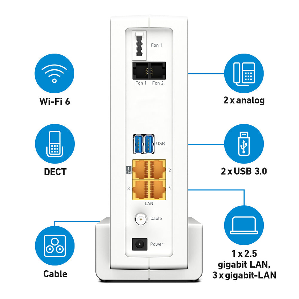 De krachtige DOCSIS 3.1 kabelmodem levert downstreamsnelheden tot wel 6 Gbit/s en is achterwaarts compatibel met EuroDOCSIS 3.0. Snelle Wi-Fi 6 (Wi-Fi AX) maakt voor al je multimedia-apparaten draadloze internettoegang mogelijk, Multi-User MIMO zorgt ook bij parallel gebruik van verschillende apparaten voor topwaarden bij de transmissiesnelheid. Een 2,5-gigabit-LAN-aansluiting, drie 1-gigabit-LAN-aansluitingen en een krachtige telefooncentrale met veel functies maken de uitrusting compleet.