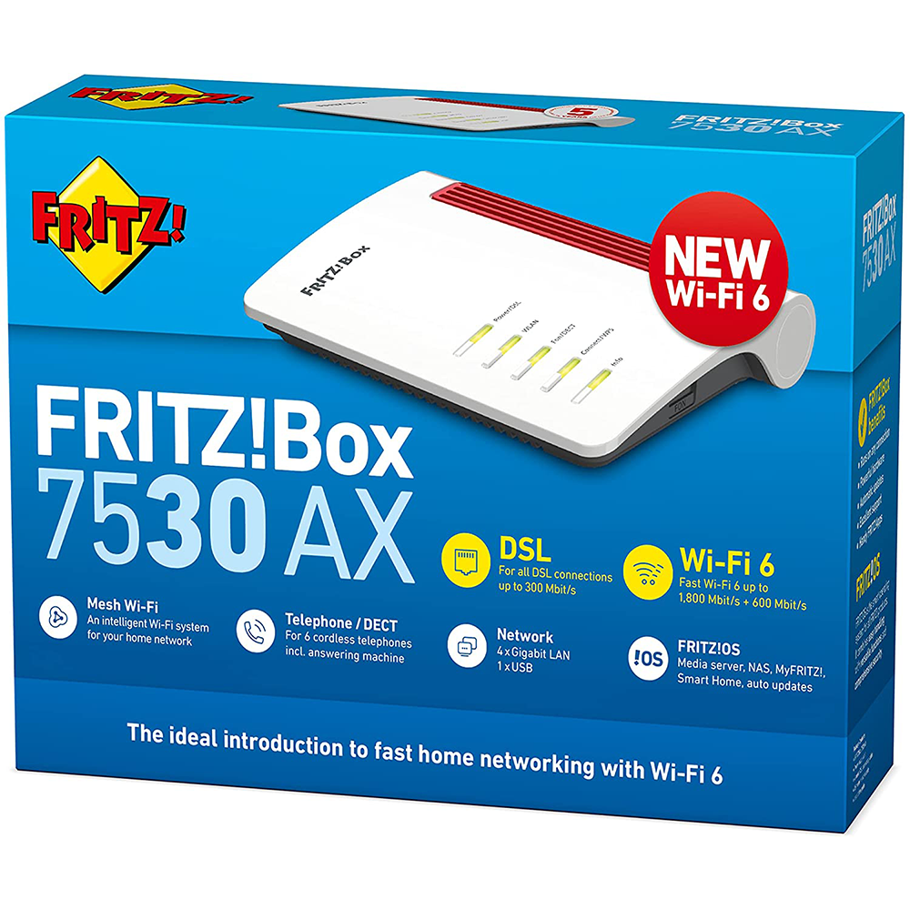 De FRITZ!Box 7530 AX is geschikt voor alle DSL-aansluitingen tot 300 Mbit/s. ADSL, ADSL2+, VDSL of supervectoring 35b: je FRITZ!Box brengt de verbinding tot stand zodat jij gewoon achterover kunt leunen en genieten van snel internet. Vier gigabit-LAN-aansluitingen en een USB-aansluiting bieden veelzijdige mogelijkheden. Daarmee kun je niet alleen al je eindapparaten gemakkelijk in het netwerk integreren, maar ook je printer integreren en een USB-opslagmedium beschikbaar stellen. Zo heb je toegang tot je films, foto's en muziek wanneer en waar je wilt.