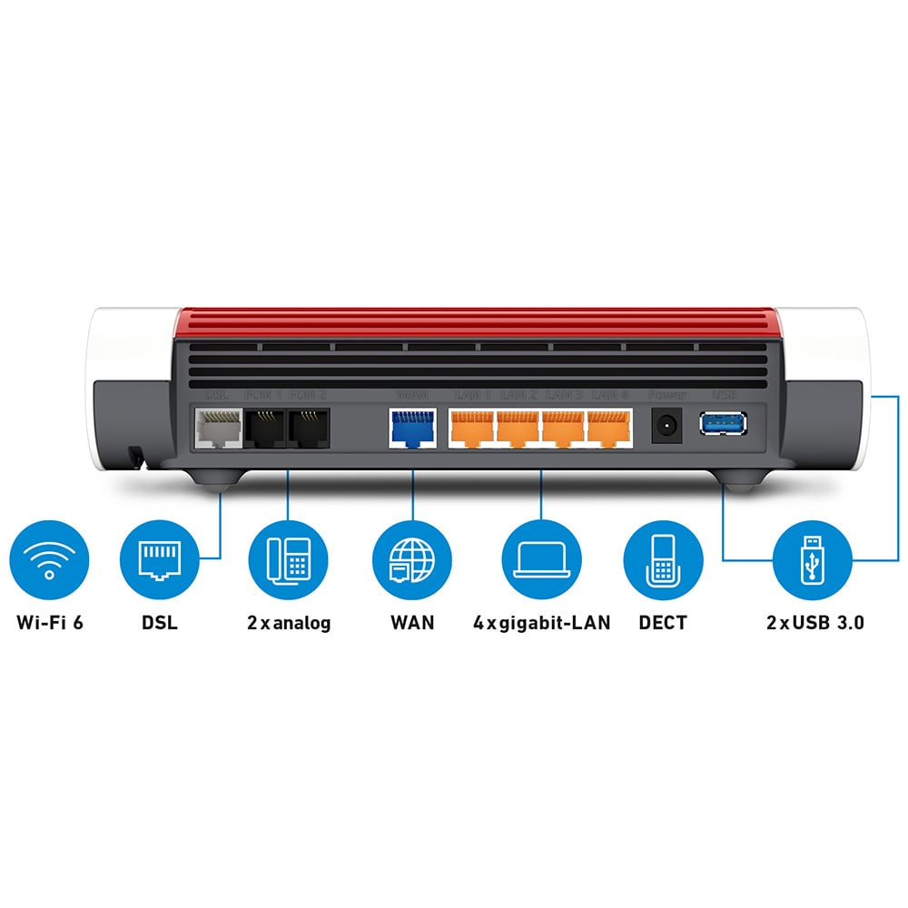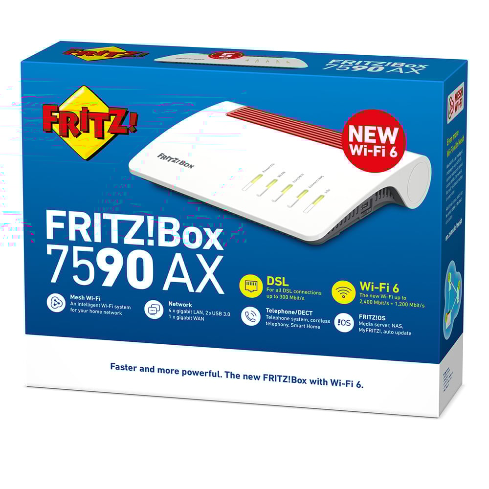 Highspeed-downloads en volop streaming-plezier – met de FRITZ!Box 7590 AX is je thuisnetwerk klaar voor actie. Wi-Fi 6 zorgt in het Wi-Fi-netwerk voor topsnelheden. Supervectoring voor DSL tot 300 Mbit/s laat niets te wensen over. Veelzijdige functies voor je thuisnetwerk en een volwaardige telefooncentrale met DECT-basis ronden de topuitrusting af.