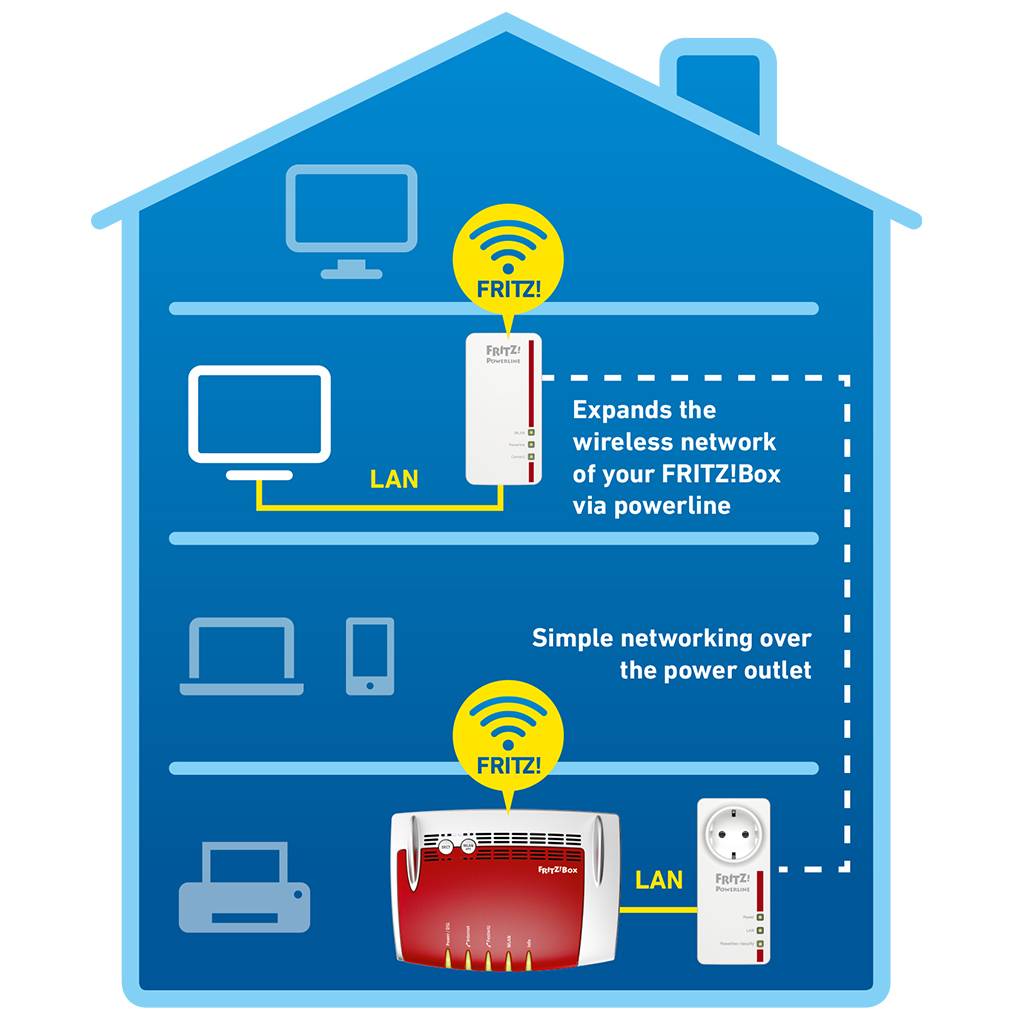 Met name onervaren gebruikers zullen de uiterst eenvoudige inrichting op prijs stellen. Steek de veilig versleutelde apparaten in de contactdoos en met slechts een druk op de knop zijn de FRITZ!Powerline-adapters gebruiksklaar. Net zo snel kun je een bestaand Powerline-netwerk uitbreiden of aanvullen met WiFi.