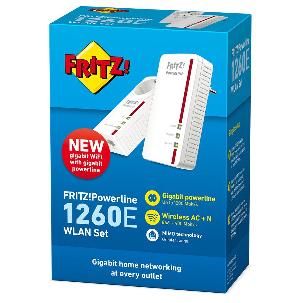 FRITZ!Powerline 1260E bereikt een heel nieuwe soort snelheid: met Powerline worden gegevens met tot 1200 Mbit/s via het stroomnet verdeeld. Je kunt bovendien WiFi zowel op de 2,4 GHz-band met tot 400 Mbit/s als op de 5 GHz-band met tot 866 Mbit/s gebruiken. Zo worden pc en televisietoestel voorzien van een razendsnelle gegevensverbinding via de stroomkabel, en smartphones en andere apparaten surfen met topspeed in het WiFi-netwerk.