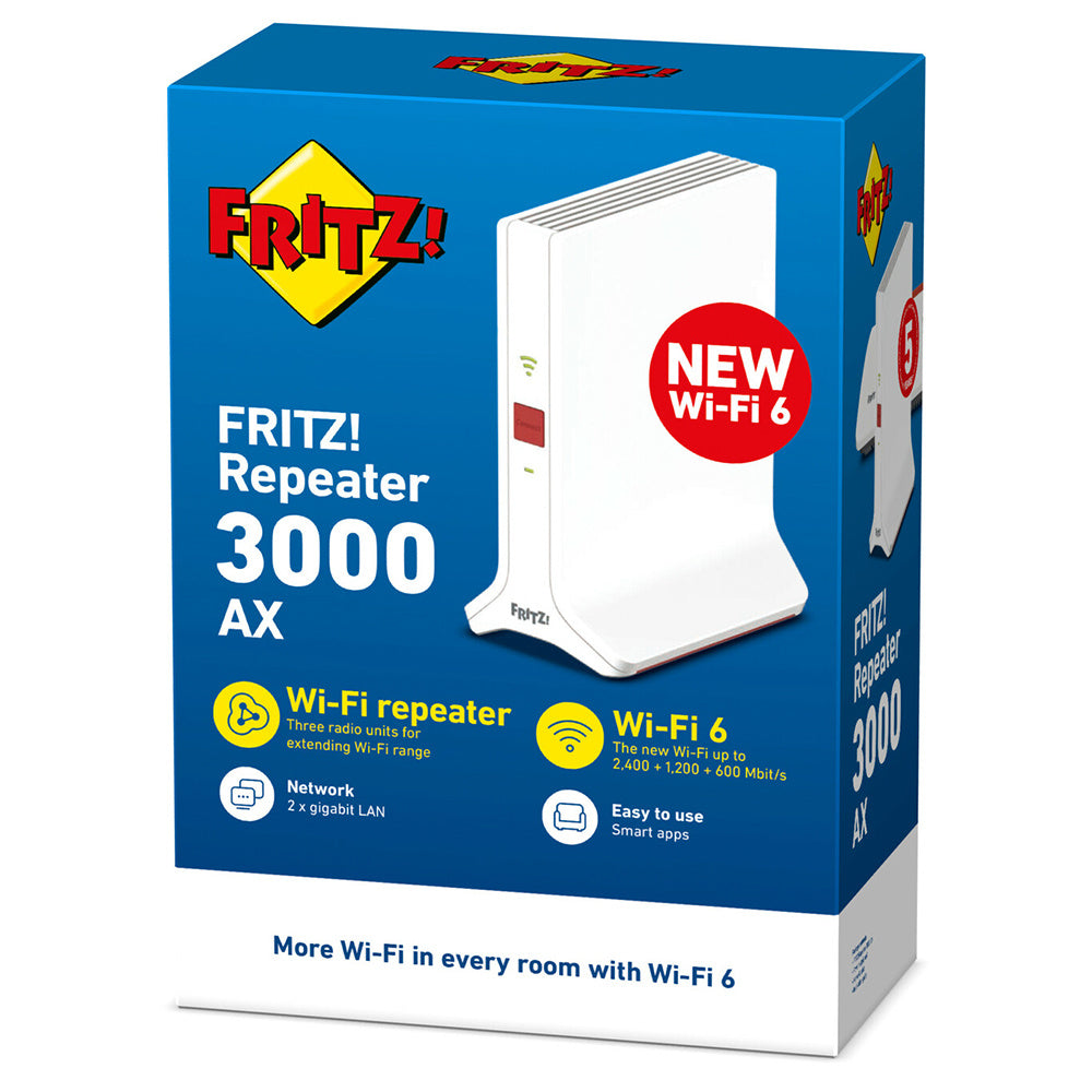 Met drie radio-eenheden, die in totaal een gegevensoverdracht van tot 4.200 Mbit/s kunnen bereiken, zorgt de repeater voor een stabiele verbinding en een maximale bandbreedte voor alle verbonden Wi-Fi-apparaten. Tegelijkertijd verhoogt de FRITZ!Repeater 3000 AX het bereik van het Wi-Fi-netwerk en zorgt voor een perfecte dekking tot in de verste hoekjes in huis.