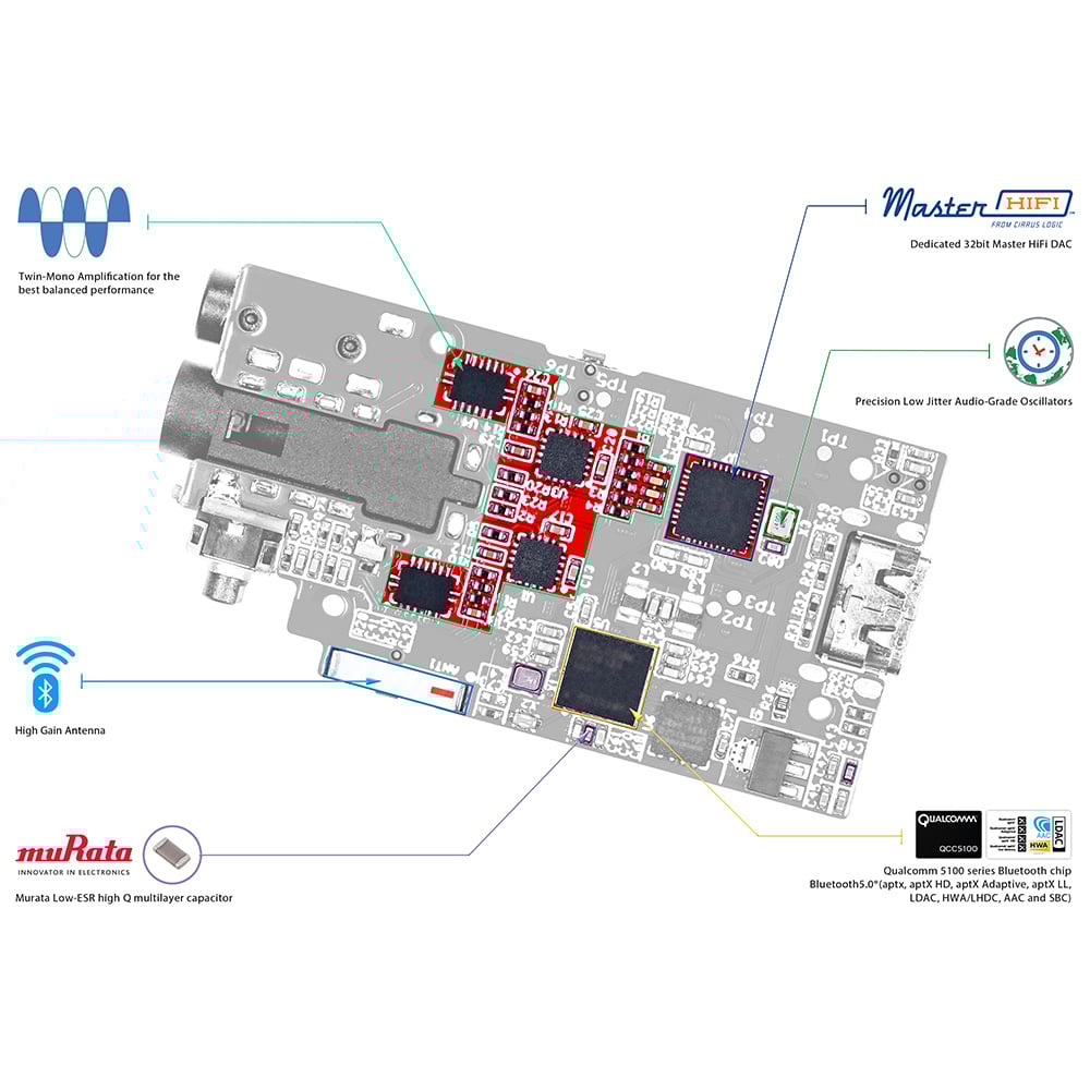 Ondanks het compacte formaat is de GO Blu voorzien van hoogwaardige gescheiden Bluetooth, DAC en twin-mono Direct Drive S-Balanced versterker circuits. Hiermee levert deze GO Blu een significant hogere geluidskwaliteit dan de vele on-chip oplossingen in de markt. Ook heeft de fabrikant XBass toegevoegd voor een betere laag met open-back hoofdtelefoons en XSpace voor nog meer ruimtelijkheid in de muziekweergave met in-ear hoofdtelefoons. Dankzij de ingebouwde auto-gain past de iFi Audio GO Blu zich automatisch aan op het gebruikte type hoofdtelefoon.