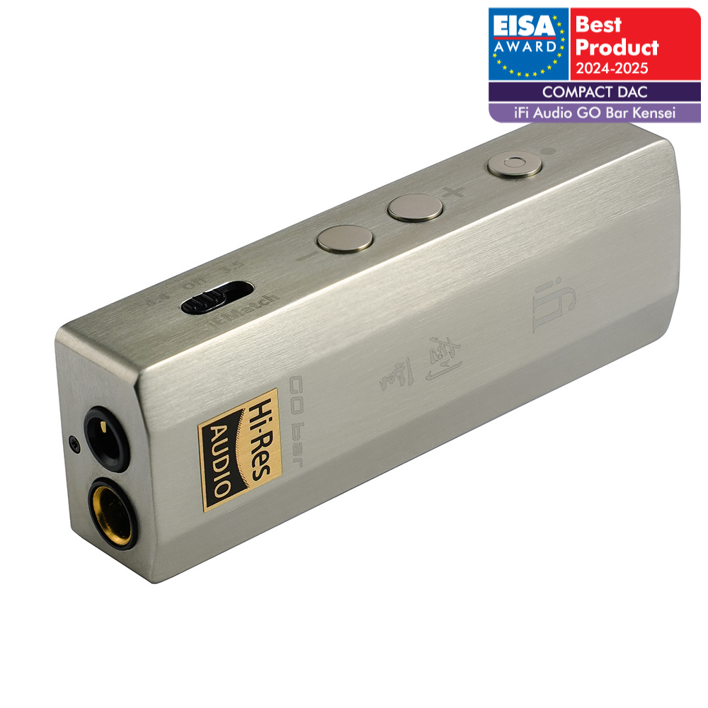 “Combining USB DAC and headphone amplifier technologies in a compact, pocket-friendly design, the GO Bar Kensei is a fit for on-the-go audiophiles. Utilising its USB-C connection for both power and hi-res file playback, iFi Audio’s stunning portable delivers a superb performance to headphones, whether IEMs or conventional over-ear designs, via its 3.5mm/4.4mm outputs. Key to this is the GO Bar’s high-quality hardware engineering, and the integration of JVCKenwood’s K2HD processing to revive the natural sound of digital recordings. A choice of filters and analogue EQ presets are available to further finesse the GO Bar Kensei’s sonics, all indicated by status lights on its smart, brushed aluminium body.”