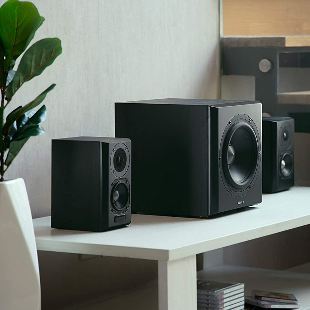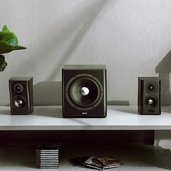 De S351DB van Edifier is een actieve 2.1 speaker set met twee compacte 2-weg satelliet luidsprekers en een bescheiden subwoofer. Combineer deze 2.1 set met je computer, televisie of game console voor een optimale beleving van films, muziek of tijdens het gamen. De subwoofer beschikt over twee lijningangen, een coaxiale en optische digitale ingang en over Bluetooth aptX 5.0. Stream je muziek draadloos vanaf je smartphone en gebruik de S351DB als compacte en goed klinkende HiFi set. Door de toepassing van een 19mm titanium dome tweeters, 8-inch subwoofer, Digital Sound Processing (DSP) en Dynamic Range Control (DRC) levert deze 2.1 set een indrukwekkende geluidskwaliteit. De ingangsselectie, volumeregeling en de bediening van Bluetooth streaming functionaliteit doe je eenvoudig met de meegeleverde Edifier Remote. Het volume en de klankkleur stel je in op de speaker zelf.