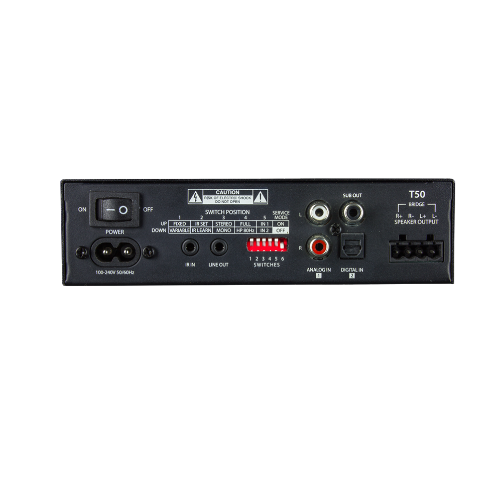 De T50, 2-kanaals klasse D-eindversterker beschikt over een mono- of stereoluidsprekeruitgang, met ondersteuning voor luidsprekers van 4 ohm en 8 ohm. Het kan 50 watt per kanaal leveren bij belastingen van 8 ohm of 60 watt per kanaal bij belastingen van 4 ohm. RCA stereo looping-uitgangen om extra zoneversterkers te voeden in gedistribueerde audiosystemen voor het hele huis. Budgetvriendelijk en veelzijdig, compatibel met dubbele spanning 110V/220V, kan worden geprogrammeerd voor gebruik met elke tv of besturingssysteem en u kunt eenvoudig bas toevoegen via de sub-uitgang. IR-afstandsbediening en wandmontagebeugels zijn inbegrepen.