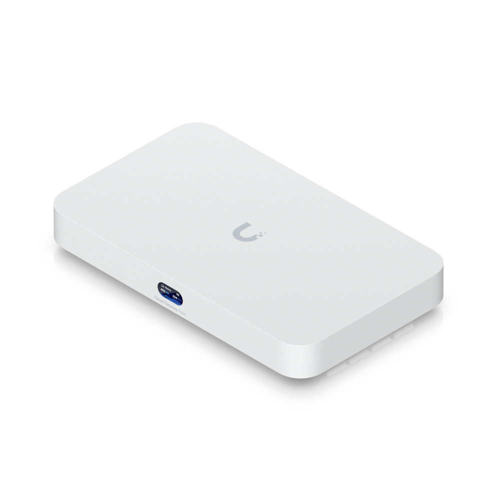 Desktop 10G Cloud Gateway met geïntegreerde 4-poorts 2,5 GbE-switch, selecteerbare NVR-opslag en volledige ondersteuning voor UniFi-applicaties.