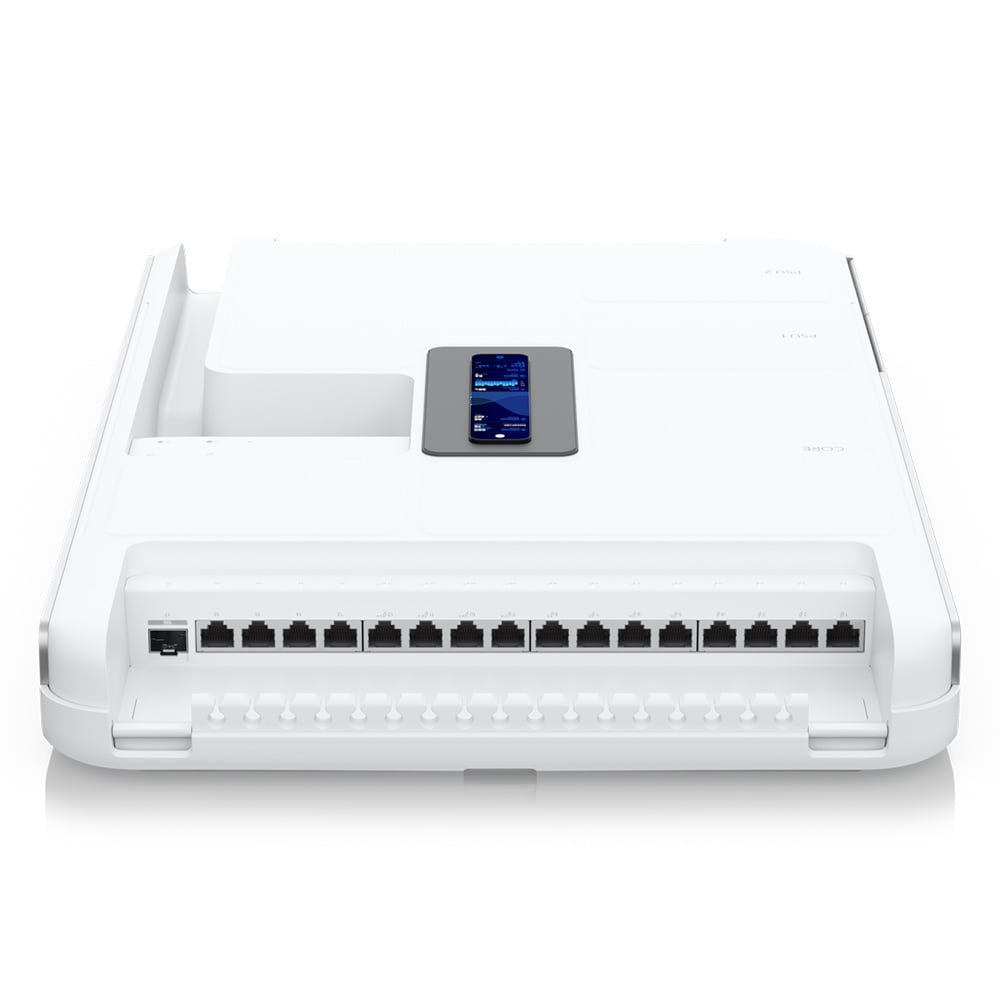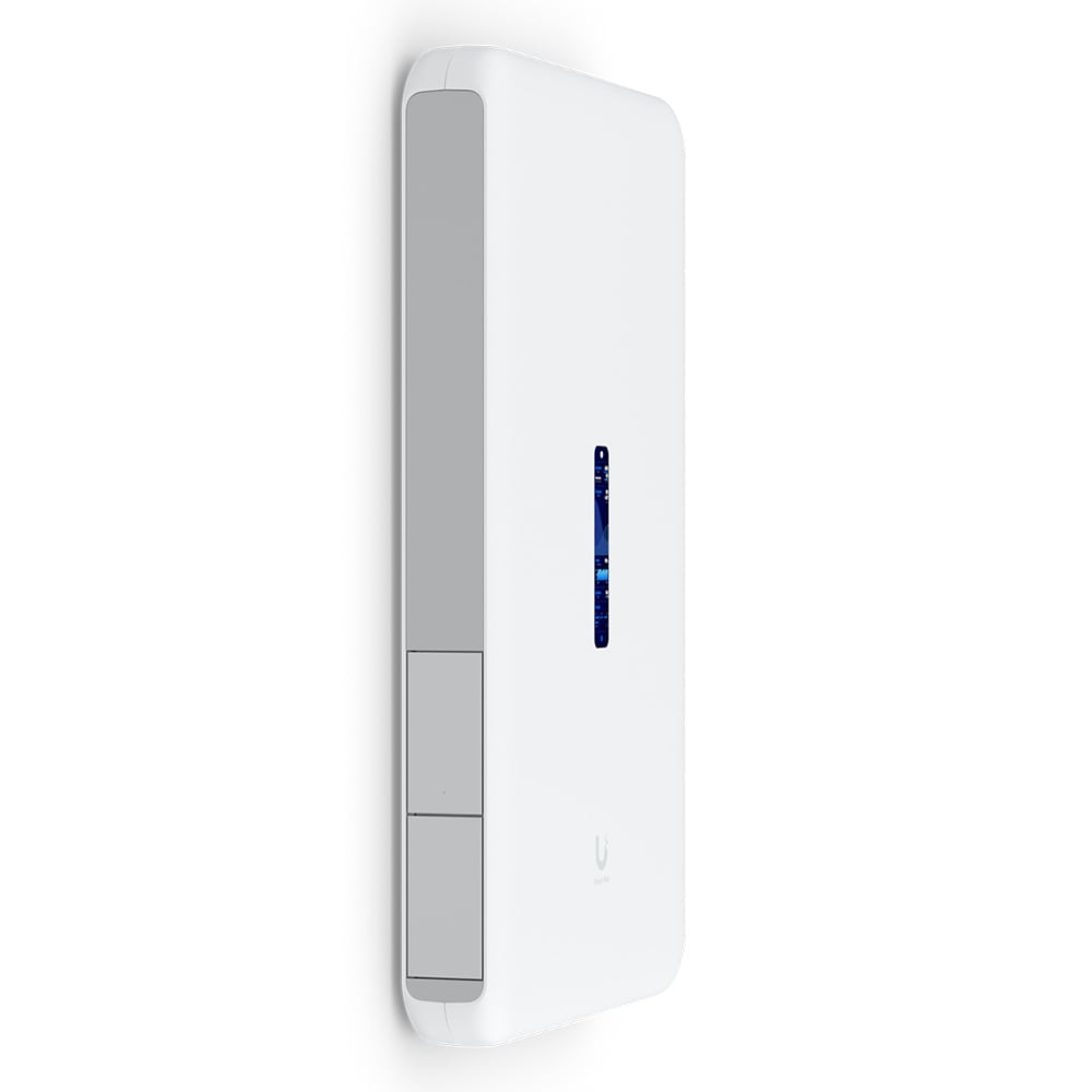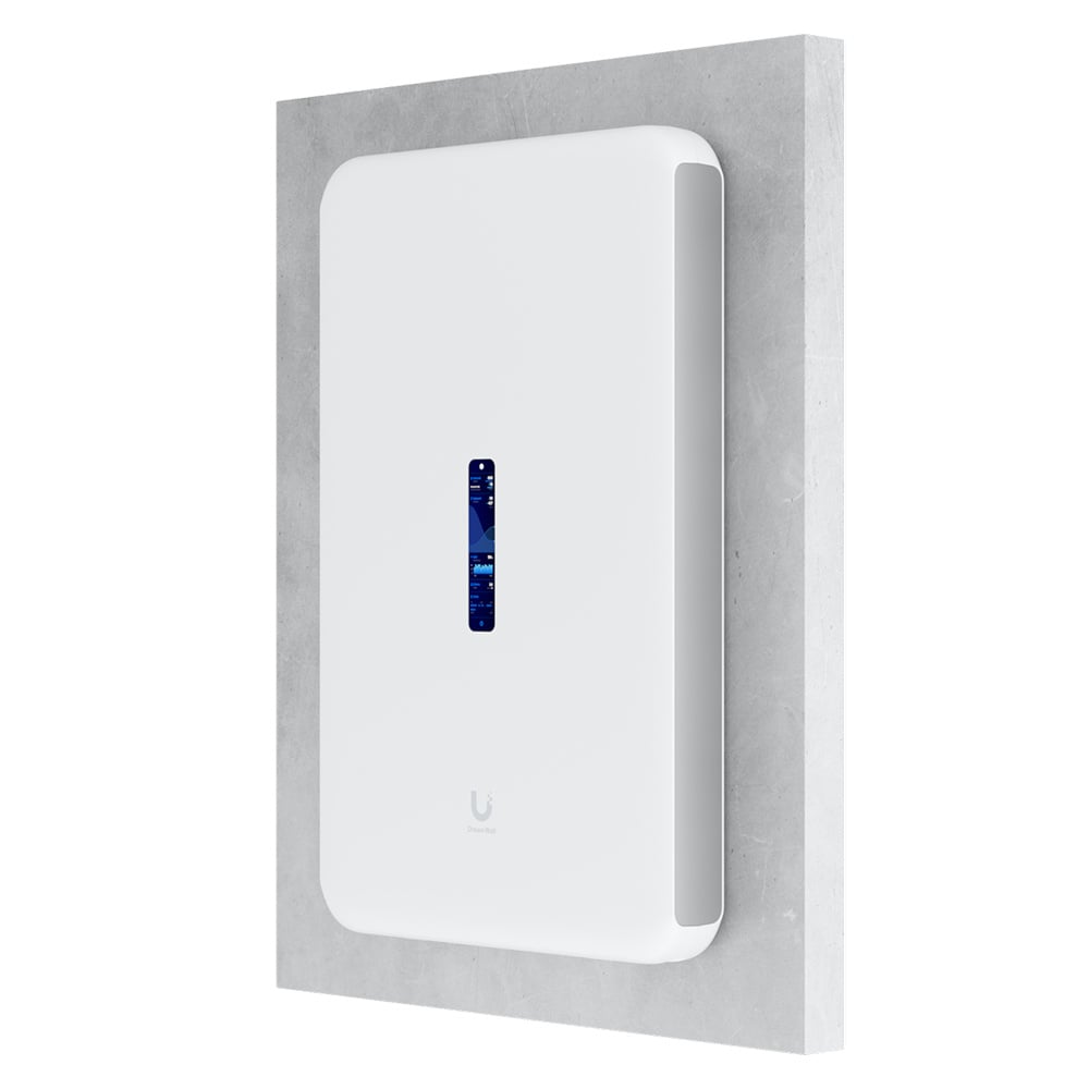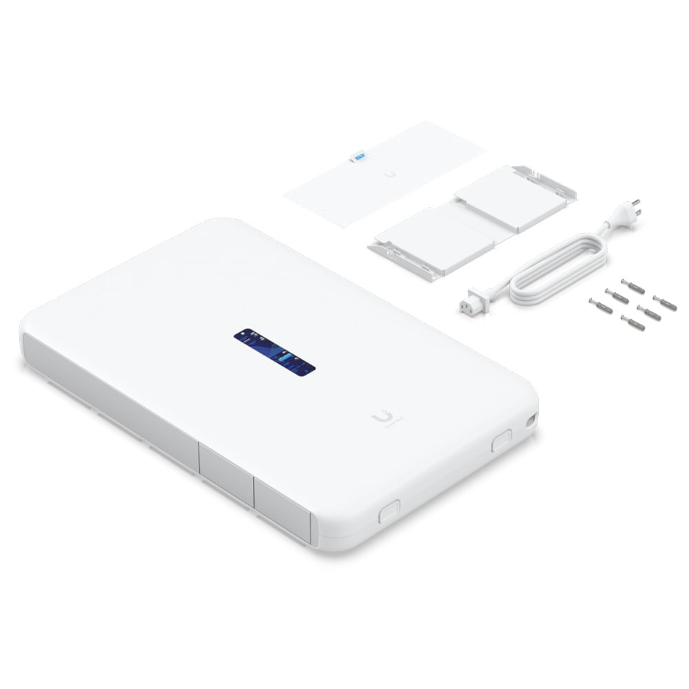 Aan de muur te monteren UniFi Cloud Gateway met ingebouwd WiFi 6 access point, PoE-switching en volledige ondersteuning voor UniFi-applicaties.