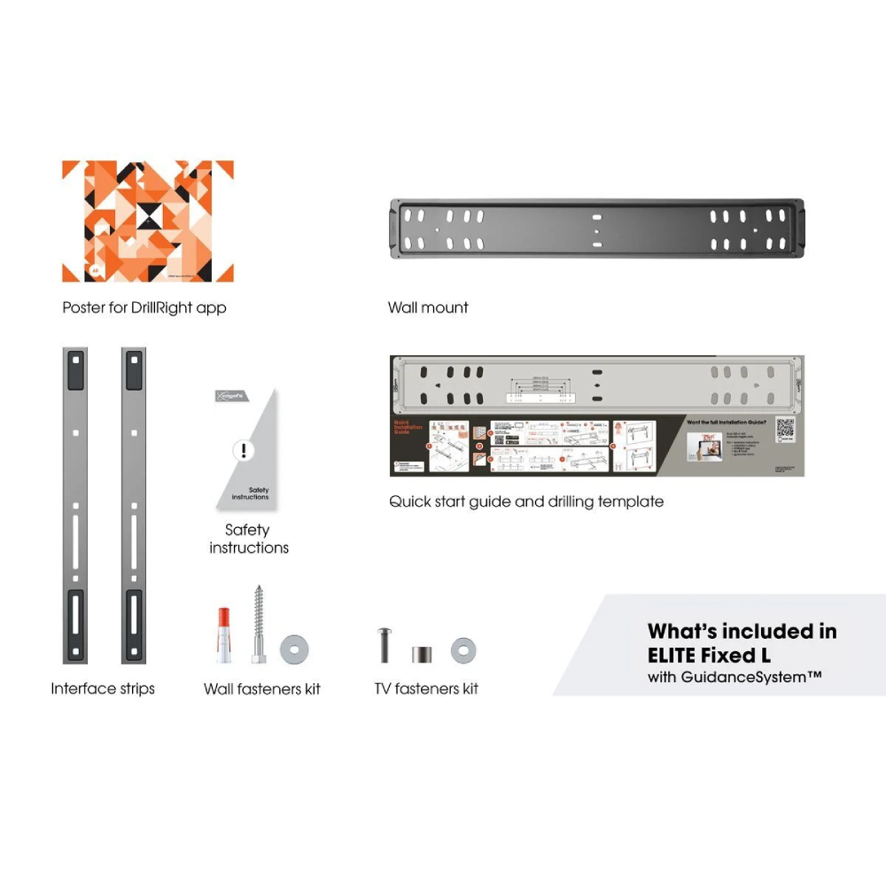 Met geïntegreerd kabelmanagement blijven bij deze montage al je kabels netjes uit het zicht. De muurplaat is extra breed (700 mm) en geschikt voor bevestiging op houten studs – superhandig dankzij de verticaal dubbele rij schroefgaten. Uiteraard krijg je er een boormal, pluggen en gebruik van onze gratis DrillRight App bij. En: 15 jaar garantie.