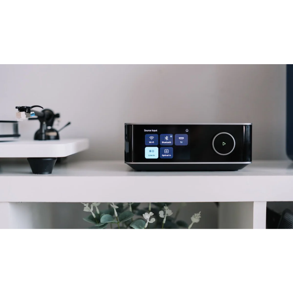 De versterker is vervaardigd uit een hoogwaardige unibody aluminium behuizing die niet alleen strak oogt, maar ook optimale koeling biedt. De voorzijde is voorzien van een helder 3.5-inch glazen touchscreen dat toegang geeft tot albumhoezen, bronselectie, instellingen en meer. Alles is direct te bedienen zonder tussenkomst van een app, waardoor gebruiksgemak en design hand in hand gaan.
