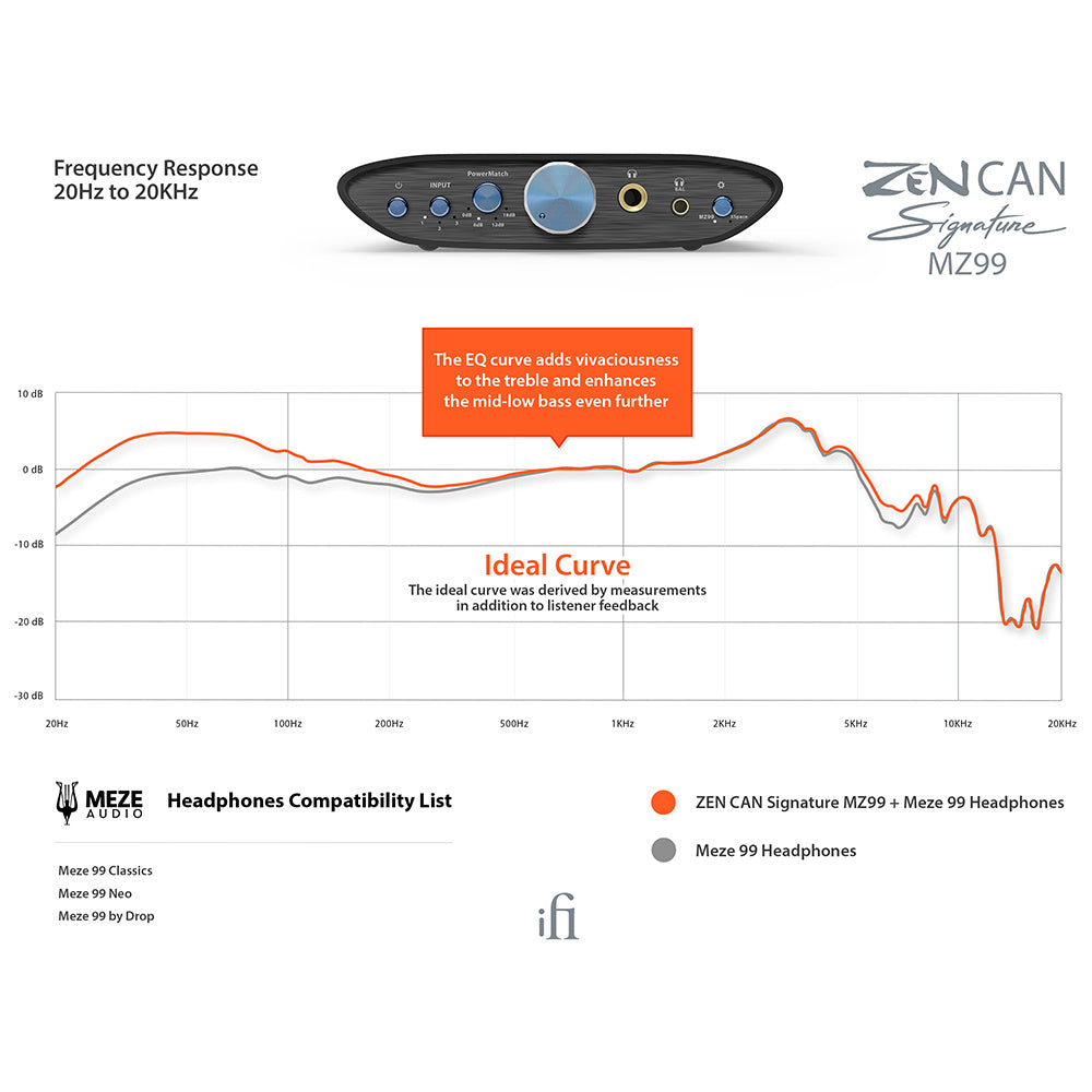 Deze ZEN CAN is geschikt voor elk type hoofdtelefoon en is voorzien van een 6.3mm en een 4.4mm Pentaconn hoofdtelefoon aansluiting. iFi heeft een gain-schakelaar op de voorzijde geplaatst die met 0dB, 6dB, 12dB of 18dB versterkt. Zet de gain bij een in-ear op 0dB en schakel op naar een maximale gain wanneer je een lastig aan te sturen planar hoofdtelefoon hebt. Speciaal voor bezitters van een Meze 99 Classics hoofdtelefoon heeft iFi Audio de MZ99 functie ontwikkeld. Deze doet kleine analoge klankcorrecties, waarmee er bij gebruik van deze hoofdtelefoons een lineaire frequentiekarakteristiek ontstaat.